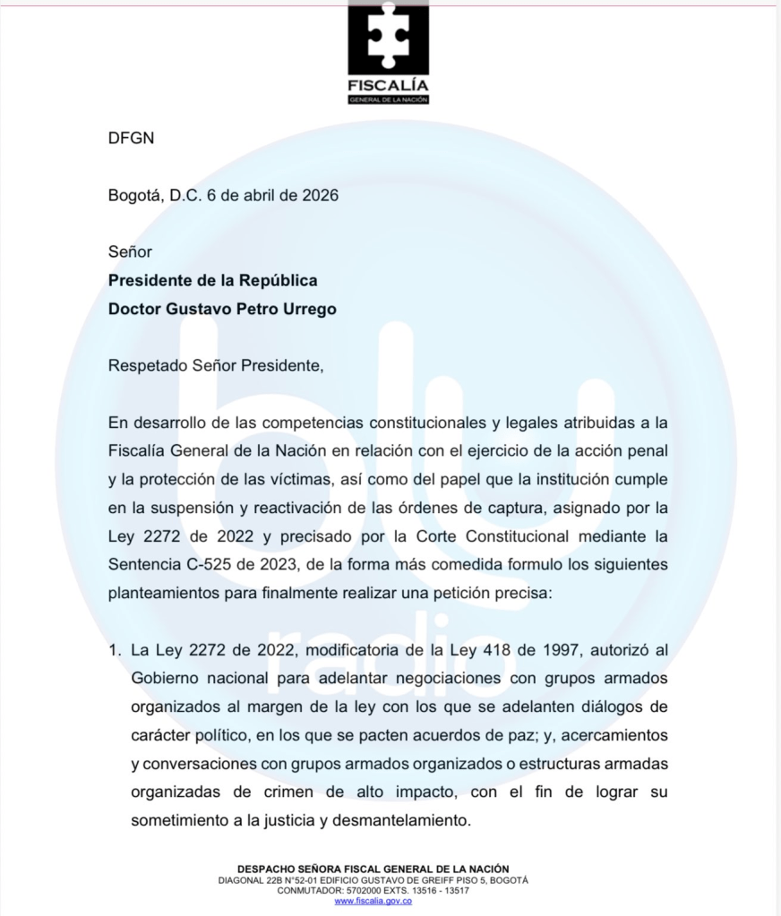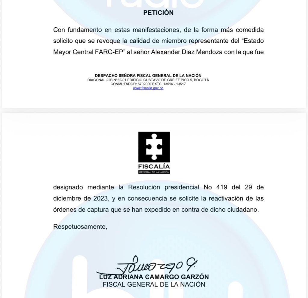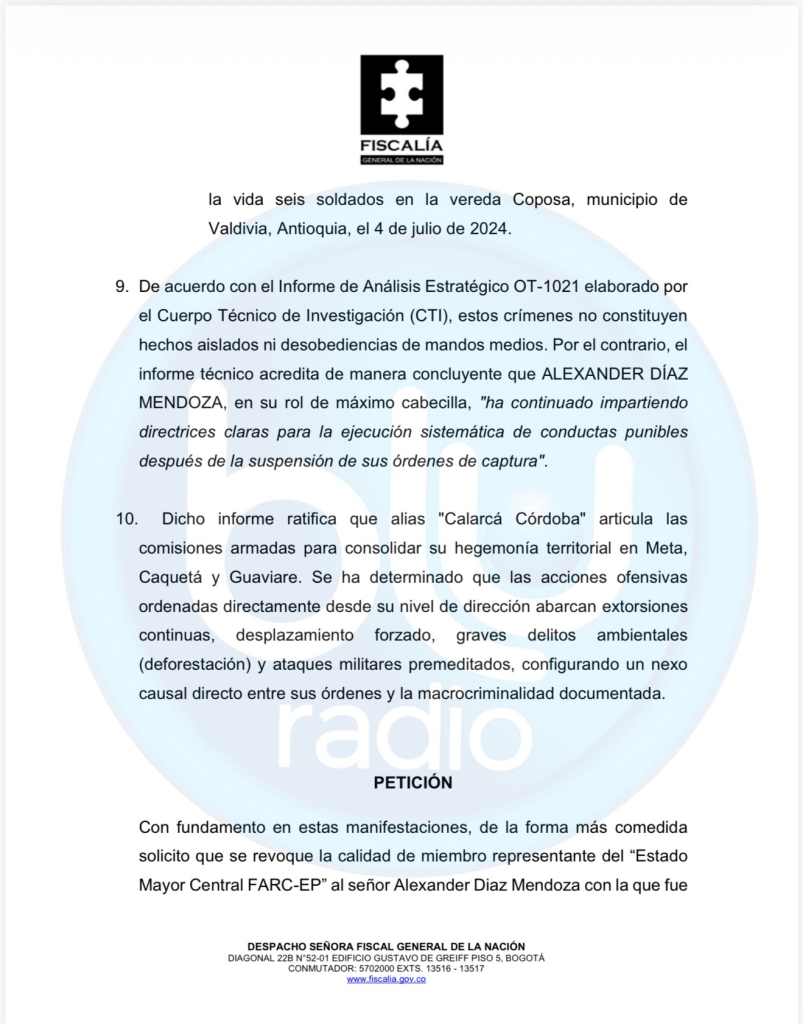 Según explicó Camargo en entrevista con Caracol Radio, la entidad ya radicó dos oficios ante el presidente Gustavo Petro. En ellos pide revocar la designación de “Calarcá” como miembro representante en la mesa de diálogo y reactivar las órdenes de captura en su contra. De manera paralela, avanzará la citación formal para imputarle cargos en un proceso que, dijo, se programará con celeridad.