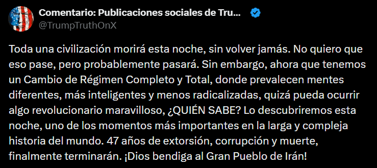 En su mensaje, Trump afirmó que lamenta la posible destrucción, pero que la considera probable si no se llega a un acuerdo. Agregó que este momento sería “uno de los más importantes en la larga historia del mundo”, subrayando la gravedad de la situación y la presión sobre el gobierno iraní.