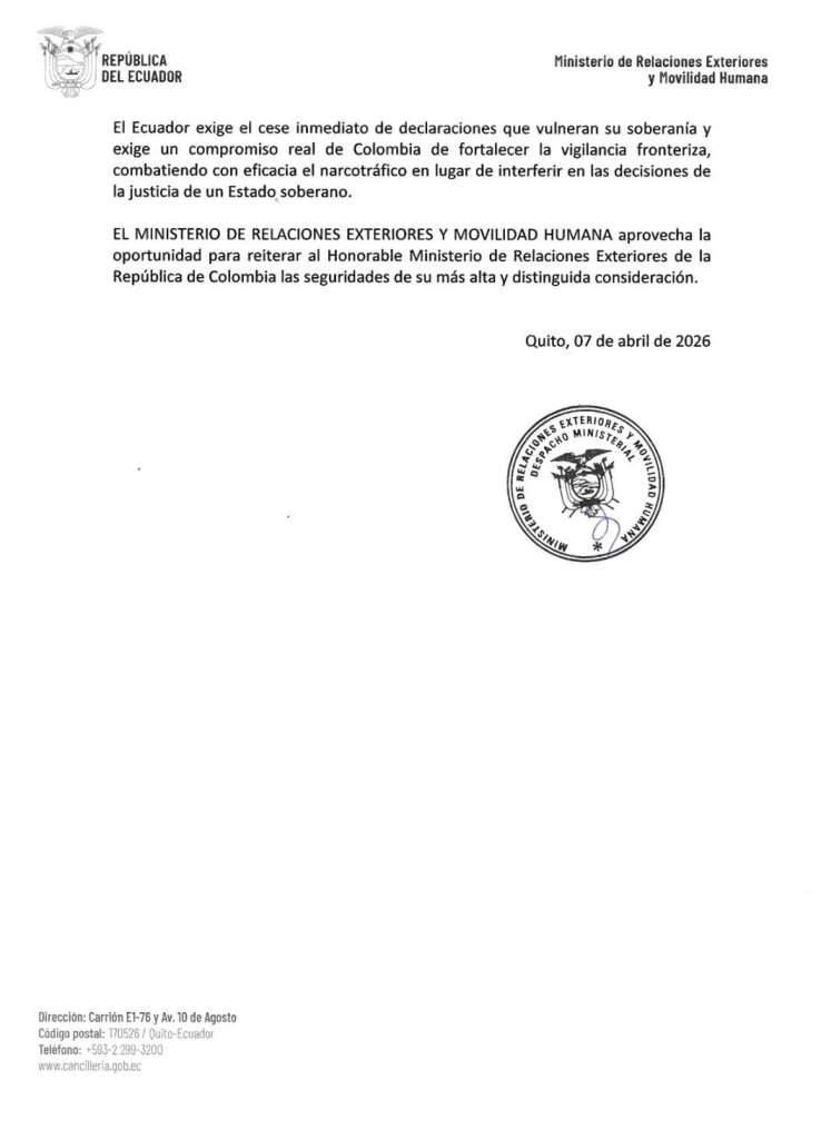 La Cancillería ecuatoriana remitió la comunicación al Ministerio de Relaciones Exteriores colombiano con una “más enérgica protesta” por lo que considera una intromisión en asuntos internos. Según la posición oficial, las afirmaciones de Petro buscan deslegitimar decisiones firmes de la justicia ecuatoriana y vulneran el principio de no intervención entre Estados.