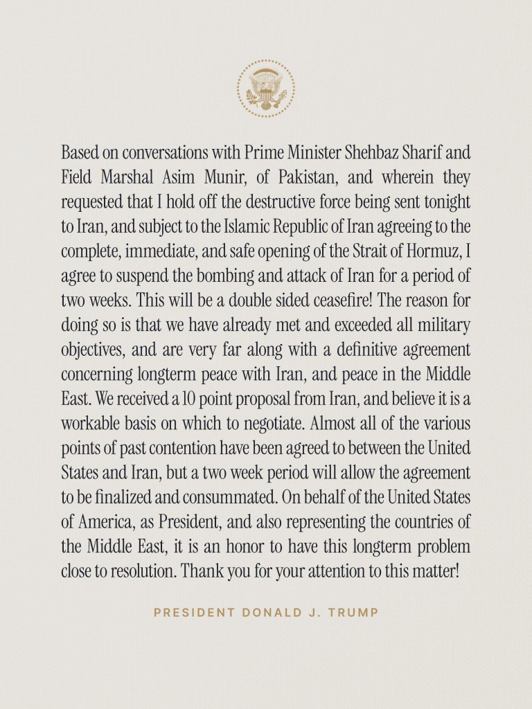 El mandatario afirmó que aceptaba “suspender el bombardeo y el ataque” durante 14 días y presentó la medida como un alto el fuego bilateral. Según su declaración, la pausa depende de que Irán garantice el tránsito por el estrecho, una ruta clave por donde circula cerca del 20% del petróleo mundial.