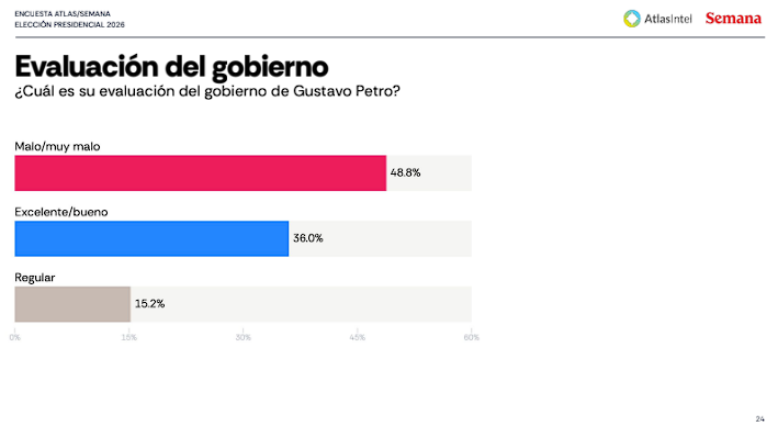 La medición, hecha por AtlasIntel para Semana, también evidencia una percepción negativa predominante sobre el desempeño del Ejecutivo. El 48,8% califica el gobierno como malo o muy malo, frente a un 36% que lo considera bueno o excelente y un 15,2% que lo percibe como regular. La diferencia de más de diez puntos entre opiniones desfavorables y favorables refleja una tendencia de insatisfacción en la opinión pública.