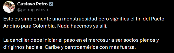 Petro reaccionó señalando que la decisión ecuatoriana marca un punto de quiebre en el esquema de integración andina y afirmó que la situación implica el cierre del ciclo de Colombia dentro del bloque. En ese contexto, pidió a la Cancillería avanzar en los trámites necesarios para abandonar la Comunidad Andina y explorar una incorporación como socio pleno del Mercosur.